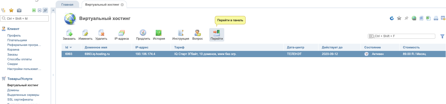 Авторизуйтесь в биллинге и перейдите в раздел "Товары и Услуги" - "Виртуальный хостинг", далее выделите услугу у которой необходимо добавить www aliase, и нажмите кнопку в верхнем меню - "Перейти в панель"
