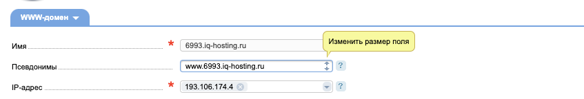Далее в меню "WWW" - "WWW домены" выбираете нужный вам сайт и нажимаете в верхнем меню "изменить", откроется окно свойств www домена, в поле "Псевдонимы" есть возможность изменить размер поля