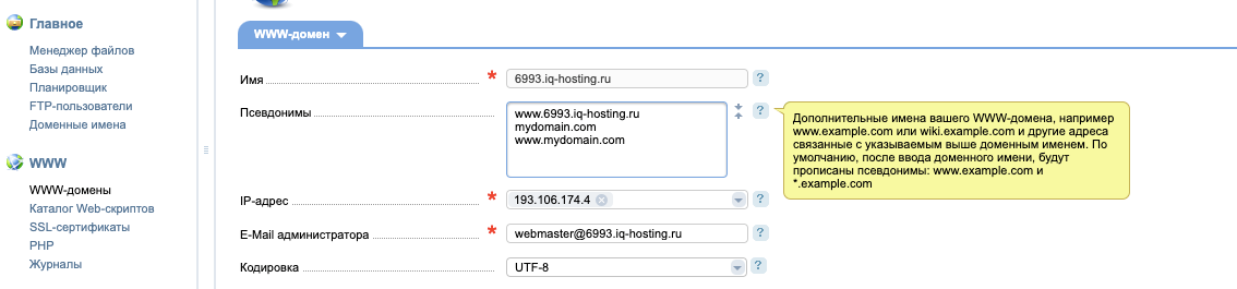 Часто, возникает необходимость добавить несколько доменных имен для вашего виртуального хостинга, для этих целей служит опция - www aliase (Псевдонимы), которая позволяет указать дополнительные доменные имена для сайта