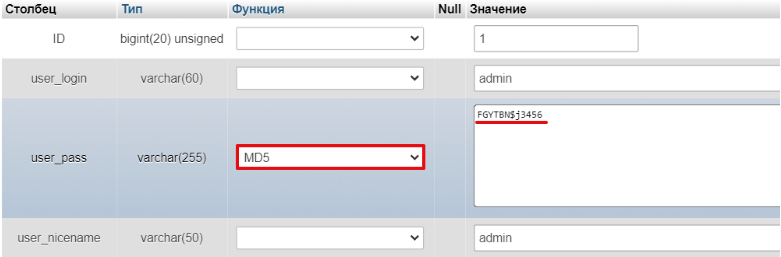 В открывшемся окне в строке user_pass выберите в выпадающем списке функцию MD5, в соседнем окне введите новый пароль администратора. Запомните или запишите новый пароль — именно по нему осуществляется вход в админку CMS. Затем нажмите Вперёд внизу страницы.