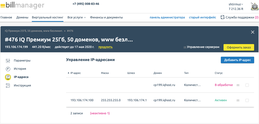 Раздел "Товары и Услуги" -> "Виртуальный хостинг"