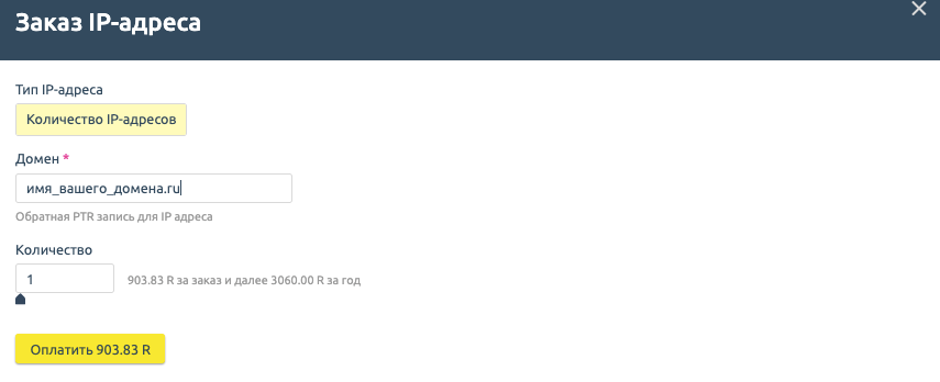 **Для добавления выделенного IP адреса ваш домен должен располагаться на наших DNS серверах. Либо вам придется самостоятельно изменить А-запись на вашей DNS площадке
